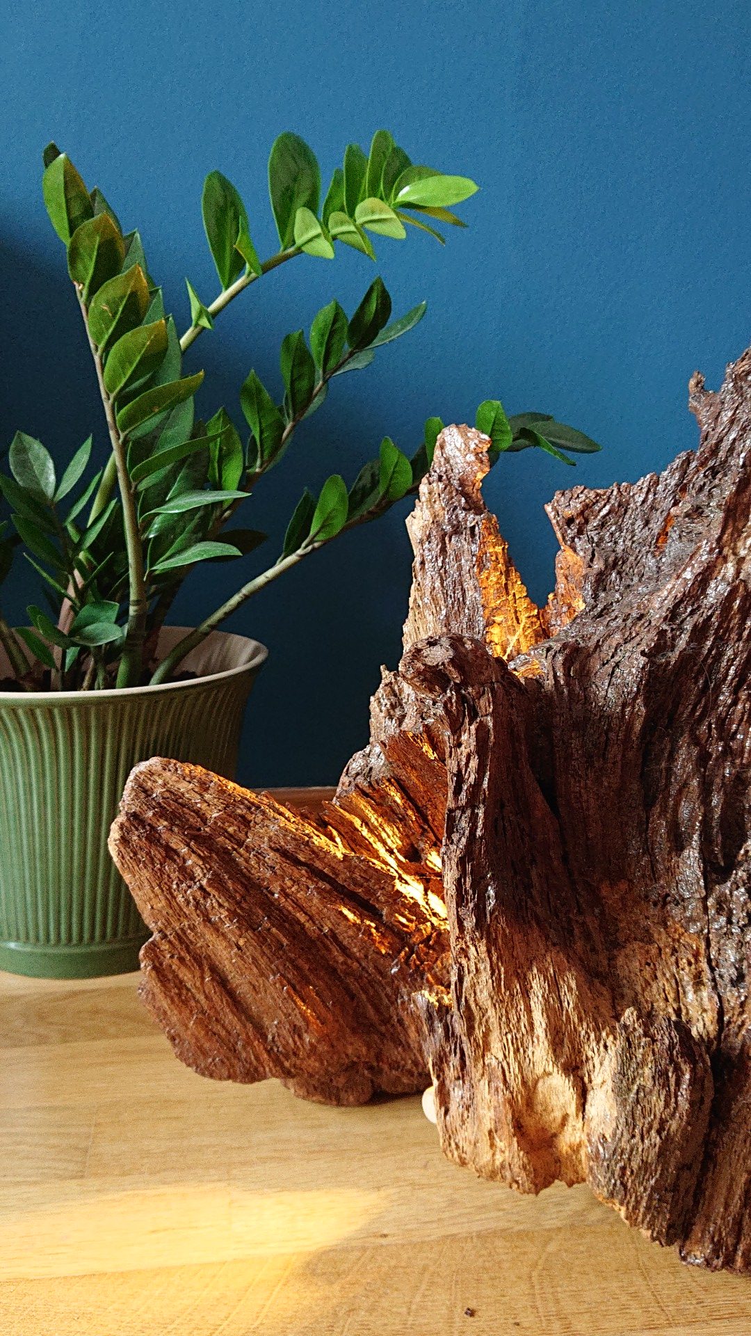 Root ist eine Wurzellampe. Sie besteht aus einem alten Eichenstumpf, der vor dem Verrotten gerettet wurde. Er wurde in mühevoller Handarbeit aufgearbeitet und mit einem Leuchtmittel versehen. Durch die unregelmäßigen Strukturen entstehen tolle Lichteffekte.