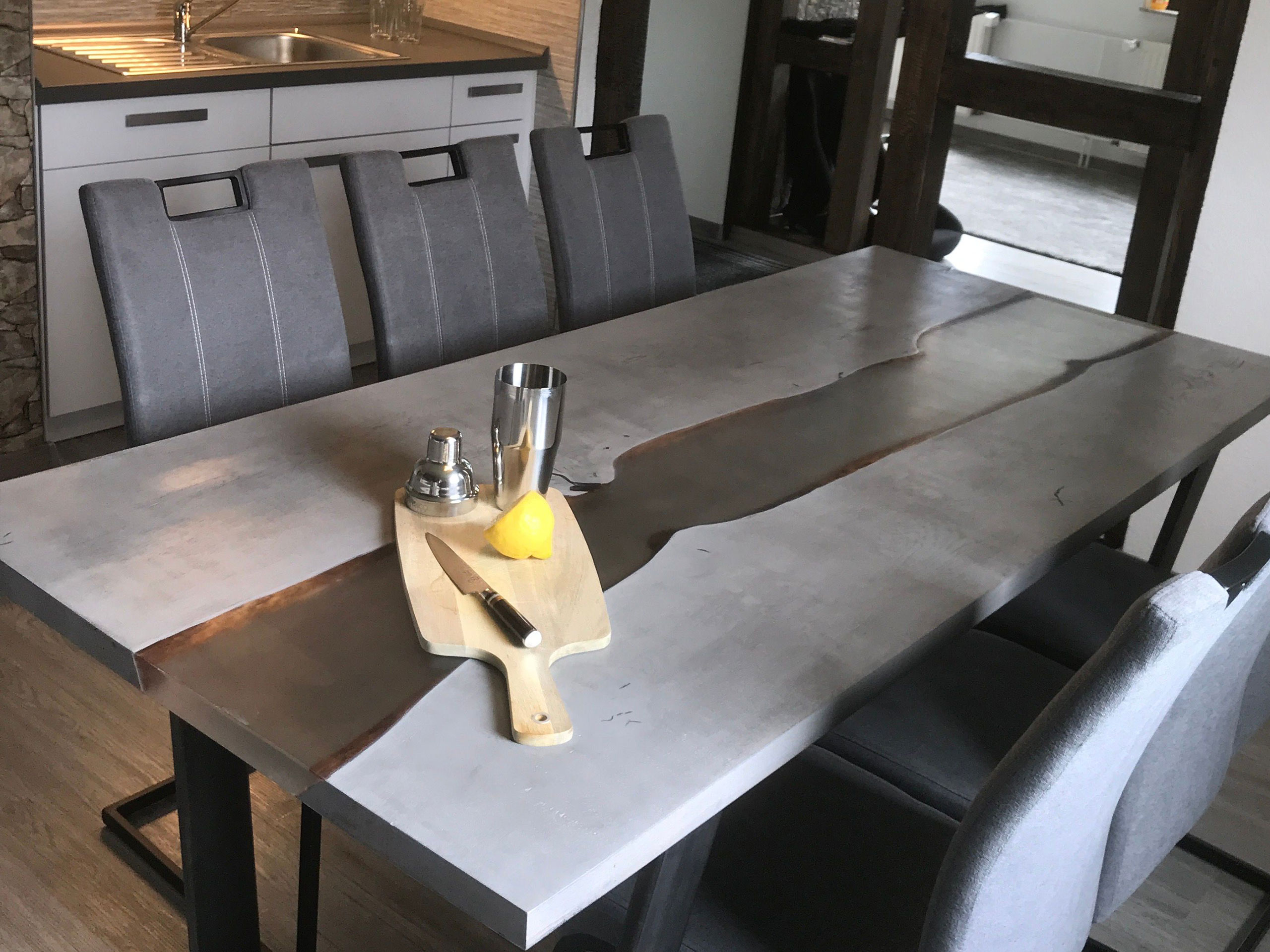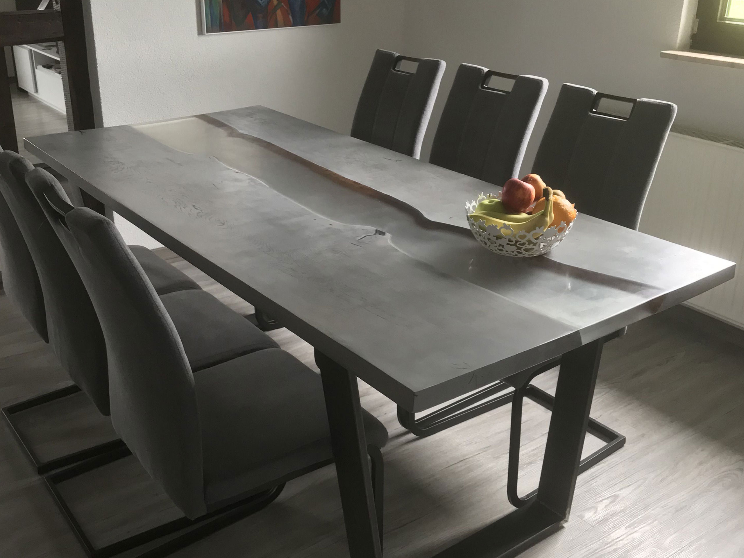 Esstisch aus massiver Eiche in Anthrazit, auf Wunsch farblich abgestimmt und Semi-Transparenten Epoxidharz. Füße Trapezförmig im modernen Industriedesign.