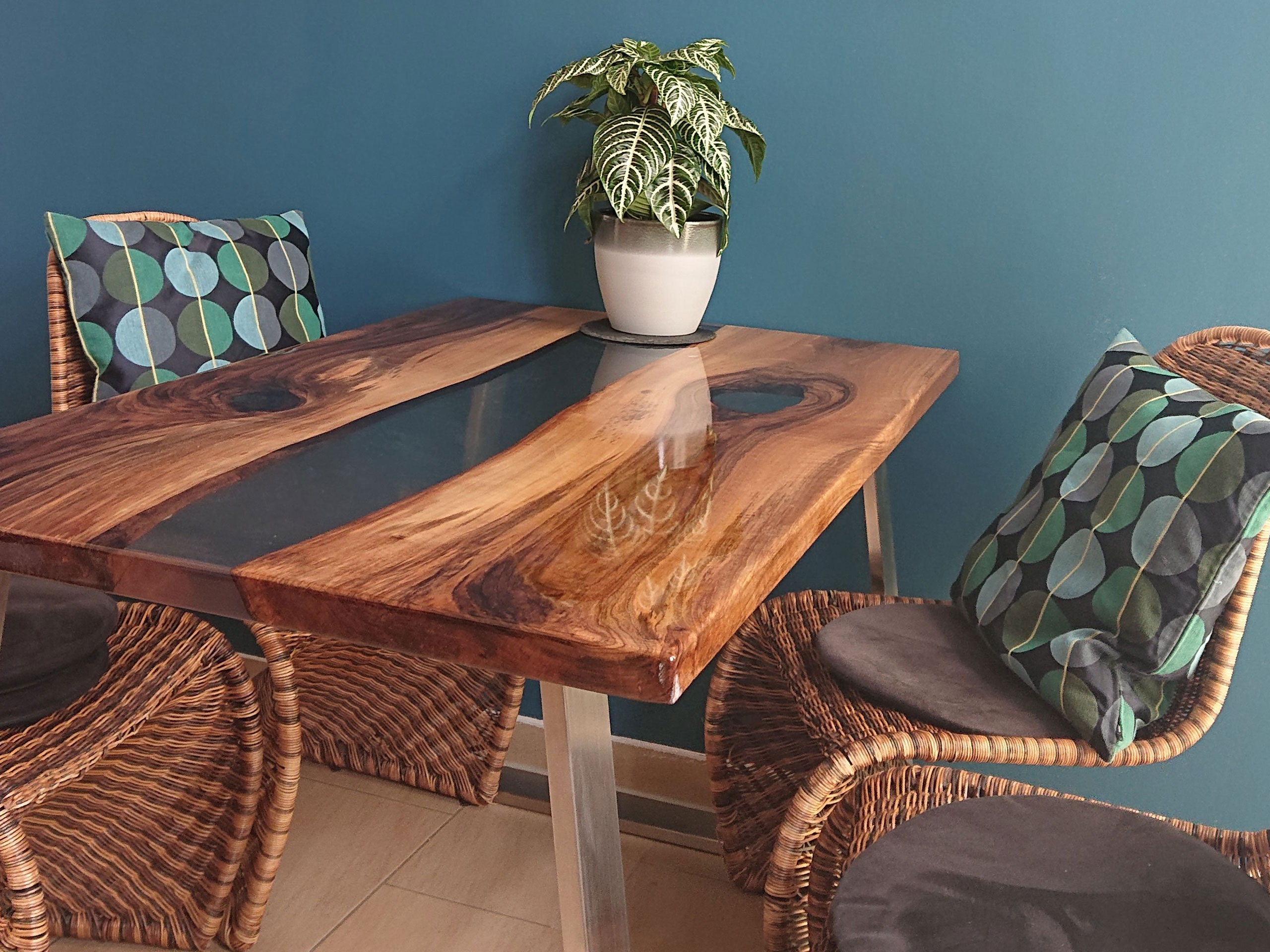 Küchentisch aus massiver Walnuss Natur mit Klar Transparentem Epoxidharz. Füße Trapezförmig in Edelstahl gebürstet.