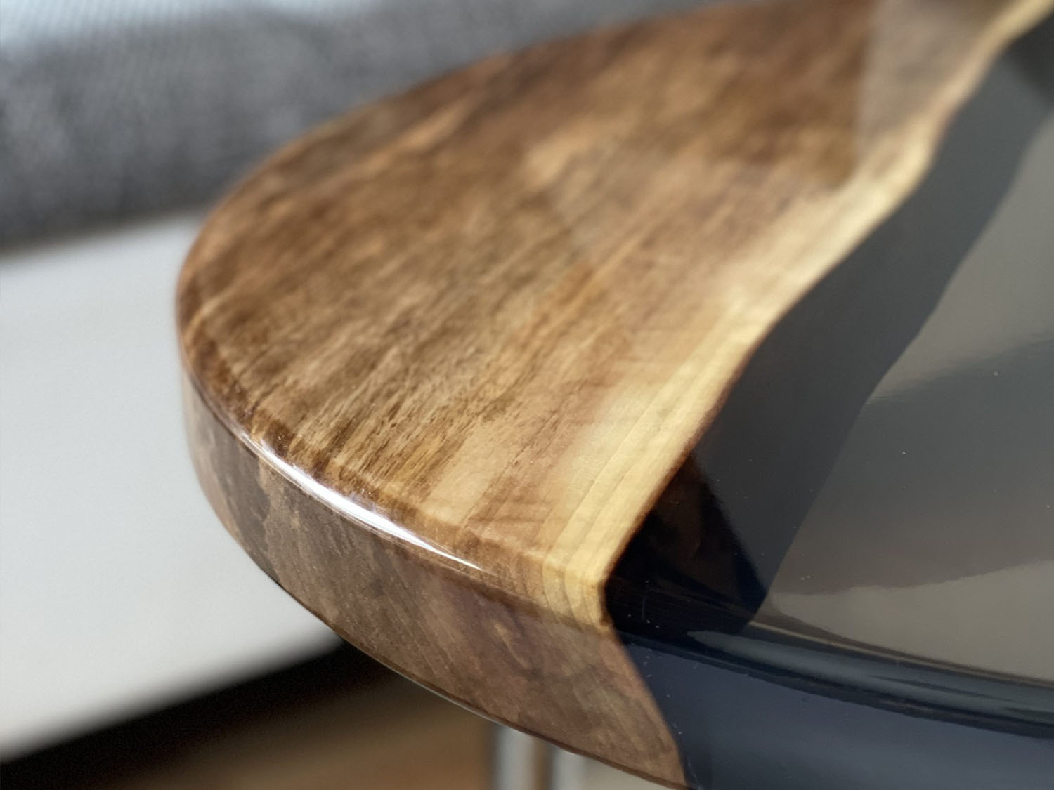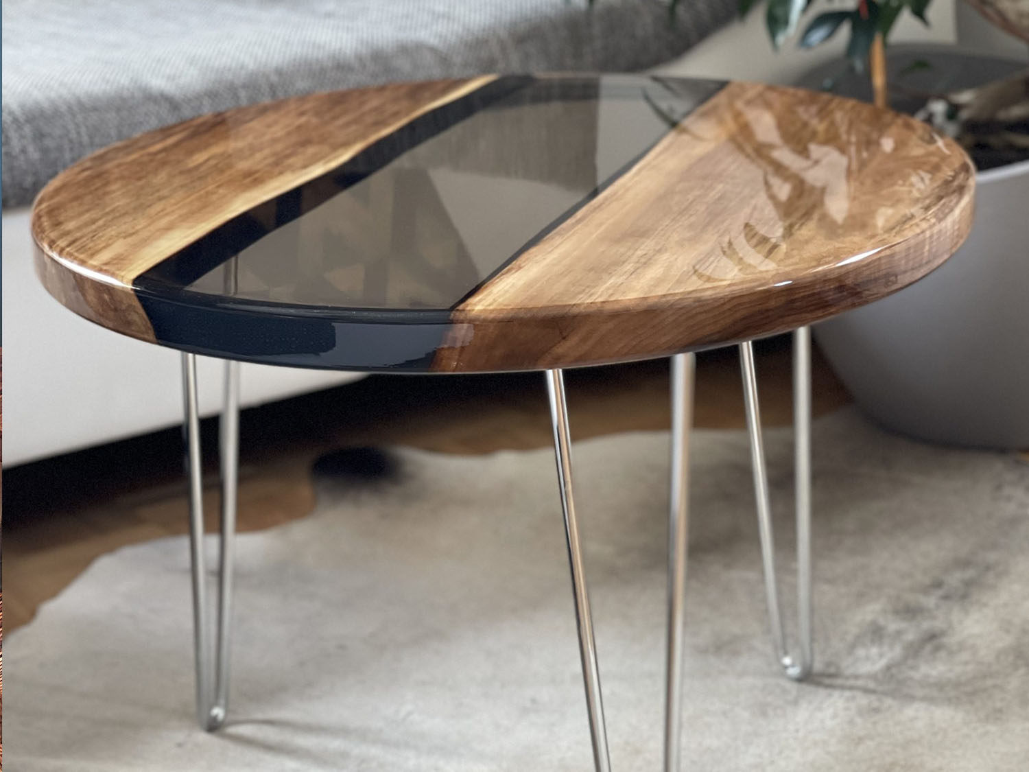 Couchtisch aus massiver Walnuss Natur mit Anthrazit Transparentem Epoxidharz. Füße Zwei-Strebig in Chromoptik.